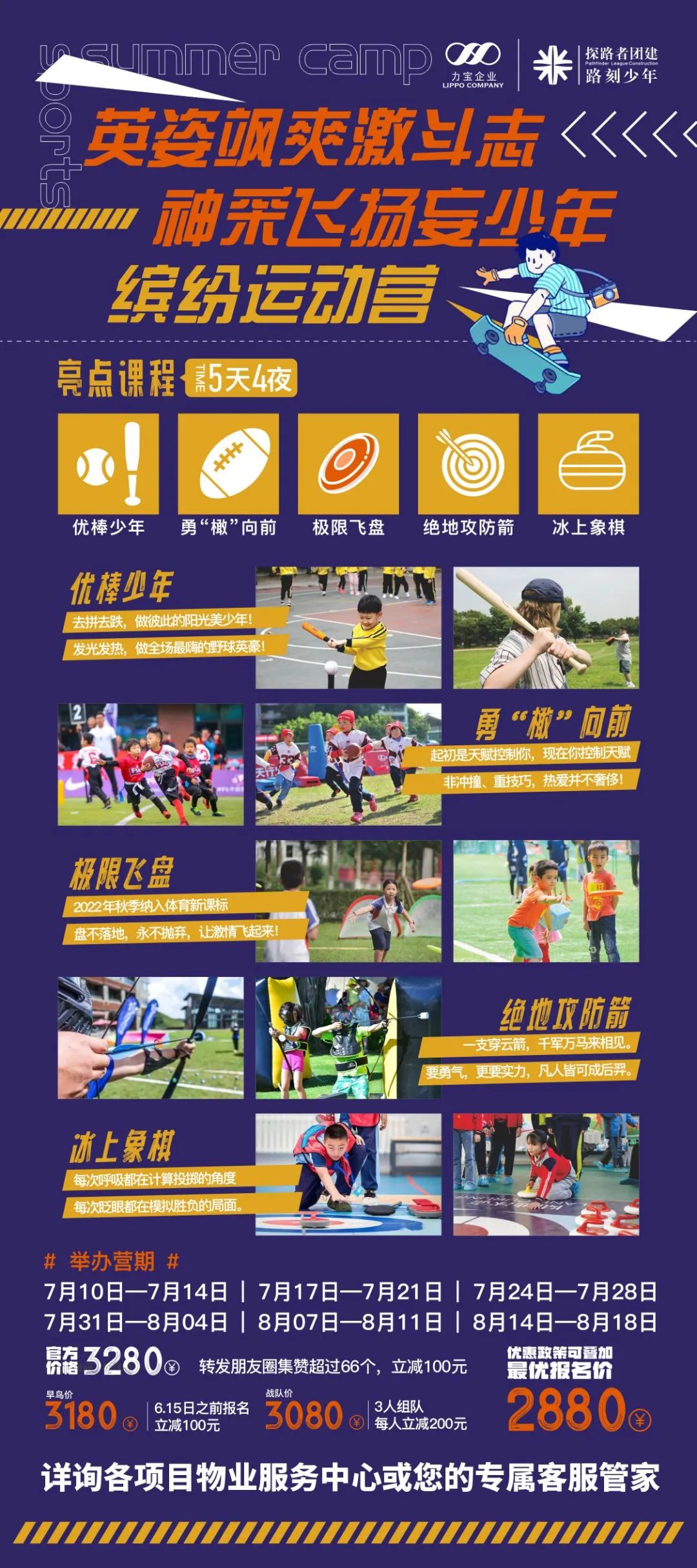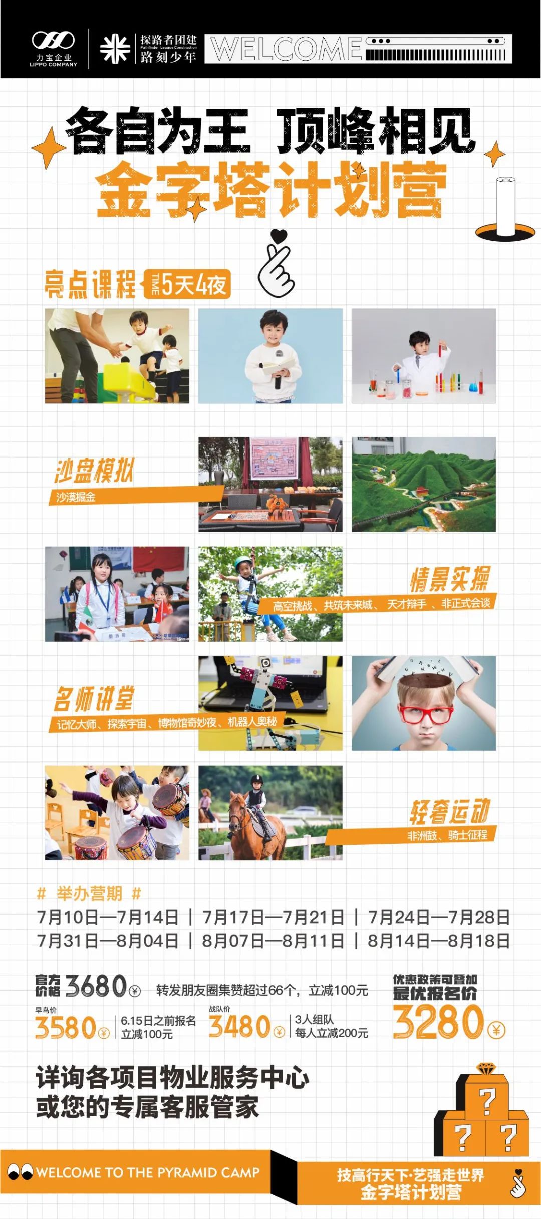 课程优势 课程主题丰富多样,涉及思维拓展、空间智能、自然探索、生存技能、沟通协作、运动技能、财务认知等,帮助青少年通过体验学习转化经验,从而提高自我独立能力和自我发展能力,让孩子们在言传身教中收获感知,在亲身的实践中提升能力,在专业课程中树立优良习惯。 课程理念 ①动静结合,身心成长(课程设计精彩,师资优良,同时辅以完善的户外拓展和体验式训练体系) ②形式多样,触类旁通(不同的训练模块让孩子们全方位地体验快乐成长的乐趣和奇妙所在。) ③阶梯递进,满足所需(针对小学,初中,高中设置不同的课程内容,极大满足成长的需要) 师资力量 夏令营团队拥有一支专业的师资团队,不仅仅责任心强、专业知识丰富、专业技能熟练且应变迅速,还亲自负责组织活动、活动策划、课题研究、项目设置等,涉及儿童心理、户外拓展、社会体育、生存急救等各个方面。 SUMMER HAPPY TIME 生活之理想,理想之生活 力宝企业甄选美好生活 为业户家人们及小朋友们 量身定制全新的夏日新体验 从生活,到美好,我们始终坚持 服务创造价值,真诚伴您一生